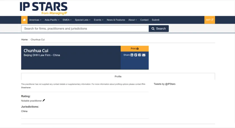 2025年10月6日,国际权威知识产权法律媒体《知识产权管理》(Managing IP)公布了其备受关注的“2025年度知识产权之星”(IP STARS 2025)榜单。北京德和衡律师事务所权益合伙人崔春花律师凭借卓越的业务能力和良好的客户口碑,以及广泛的行业认可和推荐,荣登2025年度“知名律师(Notable Practitioner)”榜单。