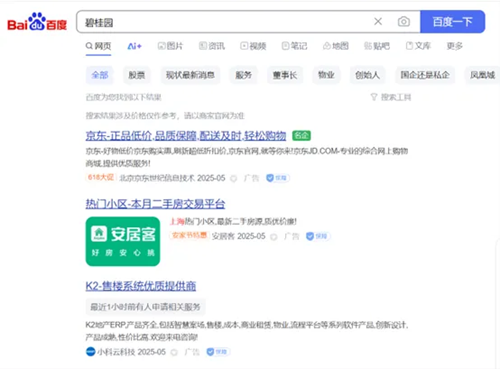 (隐性使用:在百度搜索引擎中检索“碧桂园”,出现了不含有“碧桂园”的三条推广搜索结果)
