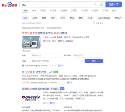 (在百度搜索引擎中检索“格力”,分别出现了关键词显性使用、隐性使用和自然流量的三种表现形式)