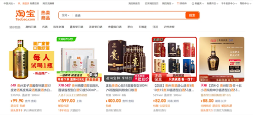 (在淘宝网搜索栏中检索“贵酒”,可以检索到不同品种的酒类商品)