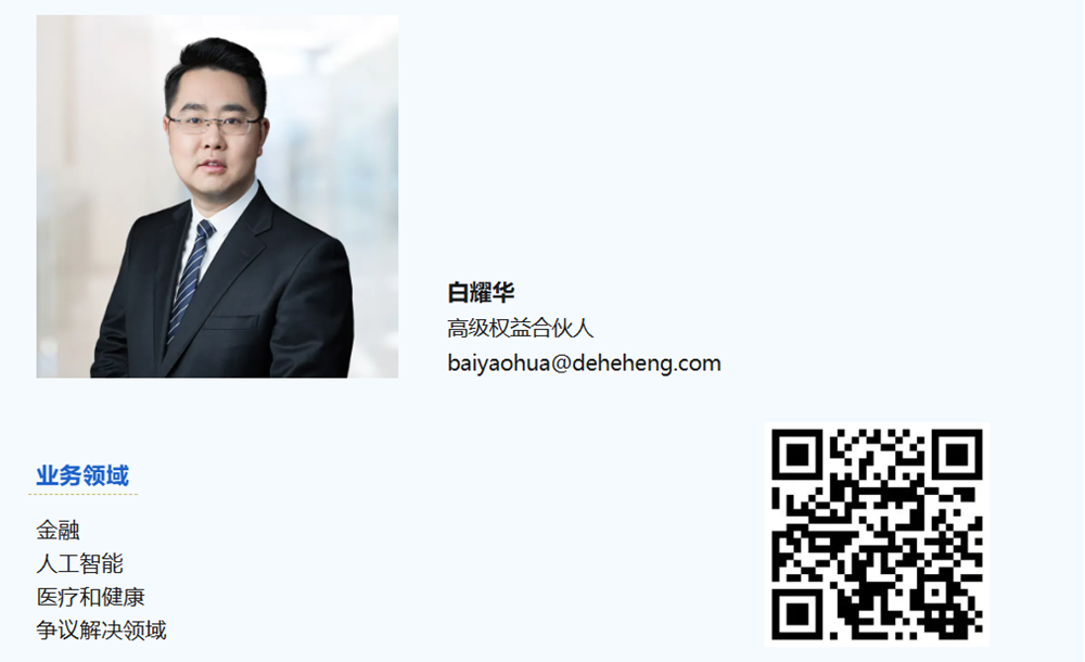 白耀华律师现任德和衡研究院上海分院院长,同济大学人工智能博士,中国浦东——剑桥大学涉外法治合作班访问学者,上海市律师协会第十一届、十二届体育业务委员会委员,兼任华东师范大学法学院实训中心导师,上海市浦东新区东方调解中心特邀调解员。近年来,白耀华律师深耕人工智能、新科技等新型法律业务,办理了一大批金额-标的大、社会影响广泛的“首起”或重大疑难案件,具有扎实的法学理论功底,为众多知名企业和高净值财富人群提供全方位的法律服务解决方案。白耀华律师以其专业素养和卓越能力赢得了广泛赞誉,白律师丰富的执业经验使其成为众多客户和机构信赖的律师,连续当选《商法》(CBLJ)The A-List 法律精英:中国业务律界精锐,并被评选为汤森路透《亚洲法律杂志》(ALB)客户首选律师,Benchmark Litigation上海地区商业争议业务领域榜单—德和衡牵头合伙人、法制日报社和中国政法大学评选的“推进立法与法治政府建设提名案例” —德和衡牵头合伙人。