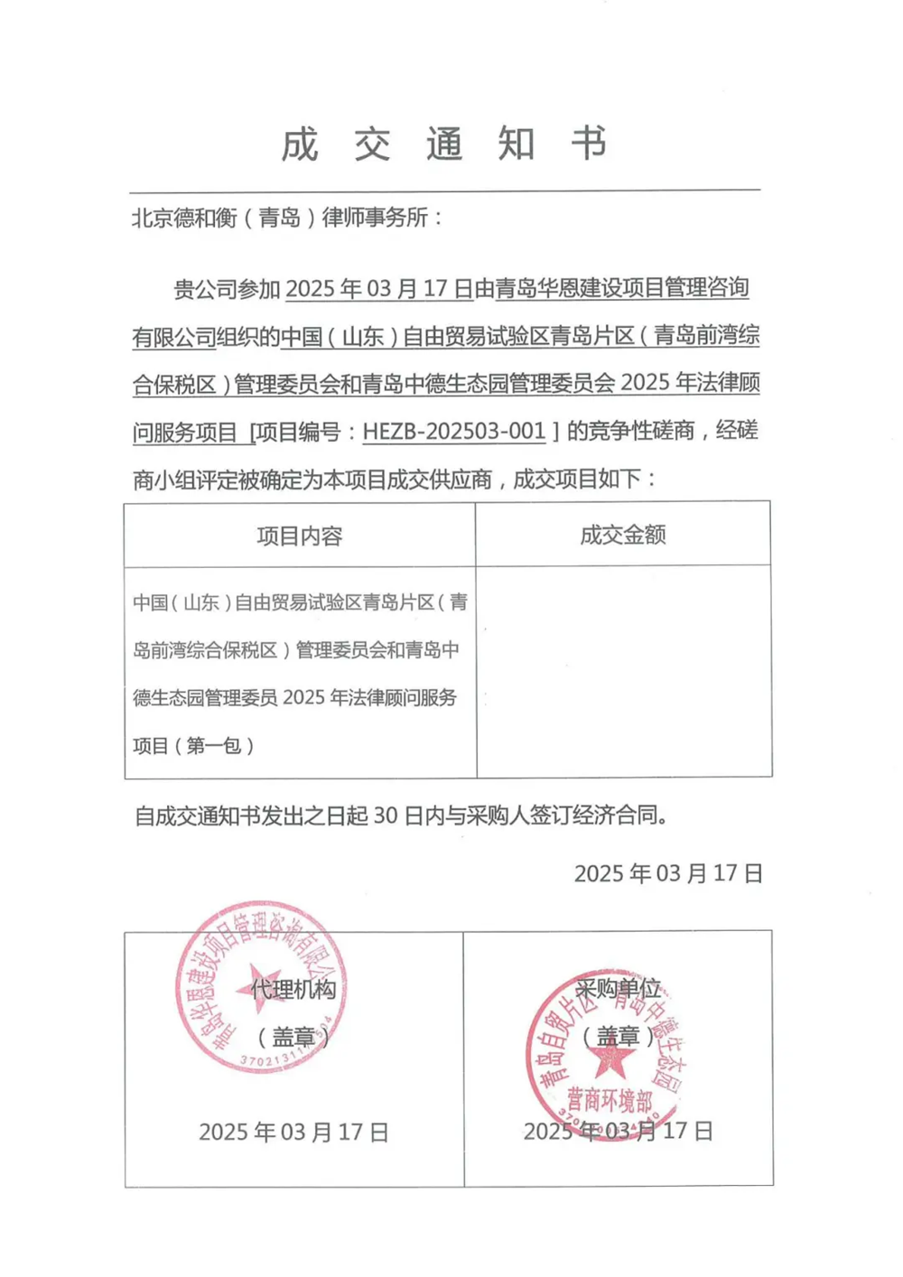近日,北京德和衡(青岛)律师事务所凭借深厚的法律服务积淀、卓越的业绩成就以及广泛的社会赞誉,经过严格竞选成功中标中国(山东)自由贸易试验区青岛片区(青岛前湾综合保税区)管理委员会和青岛中德生态园管理委员会2025 年法律顾问服务项目。此次中标既是自贸区青岛片区管委、中德生态园管委对德和衡律师专业性和服务质量的认可,也是对律所在业界良好口碑与综合实力的肯定,对于德和衡律所而言,既是一份荣誉,更是一份责任。