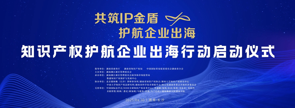2025年4月30日,由湖南湘江新区管委会主办、湘江新区商务和市场监管局及惟盛知识产权保护与发展中心承办、北京德和衡(长沙)律师事务所协办、德和衡知识产权业务中心(以下称DHH知产业务中心)参与支持的“知识产权护航企业出海行动”启动仪式在长沙成功举办。DHH知产业务中心总监黄政燏律师、学术顾问韦贵红教授、执行总监王文俊律师、副总监邹建红律师,以及中心涉外专家夏颖、葛嘉等受邀出席本次活动。
