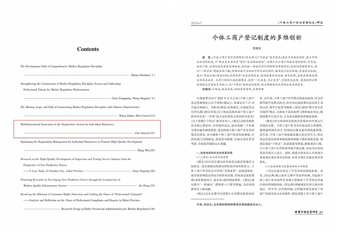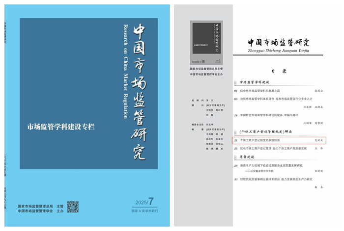 近日,北京德和衡律师事务所高级联席合伙人范俊文律师撰写的《个体工商户登记制度的多维创新》一文,在国家市场监督管理总局主管、中国市场监督管理学会主办的《中国市场监管研究》杂志2025年第7期上公开发表。