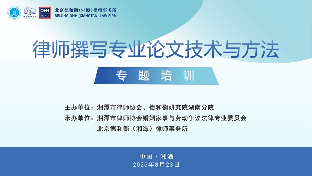 2025年8月23日,由湘潭市律师协会、德和衡研究院湖南分院联合主办,湘潭市律师协会婚姻家事与劳动争议法律专业委员会、北京德和衡(湘潭)律师事务所共同承办的“律师撰写专业论文技术与方法专题培训”在德和衡(湘潭)律师所成功举办。
