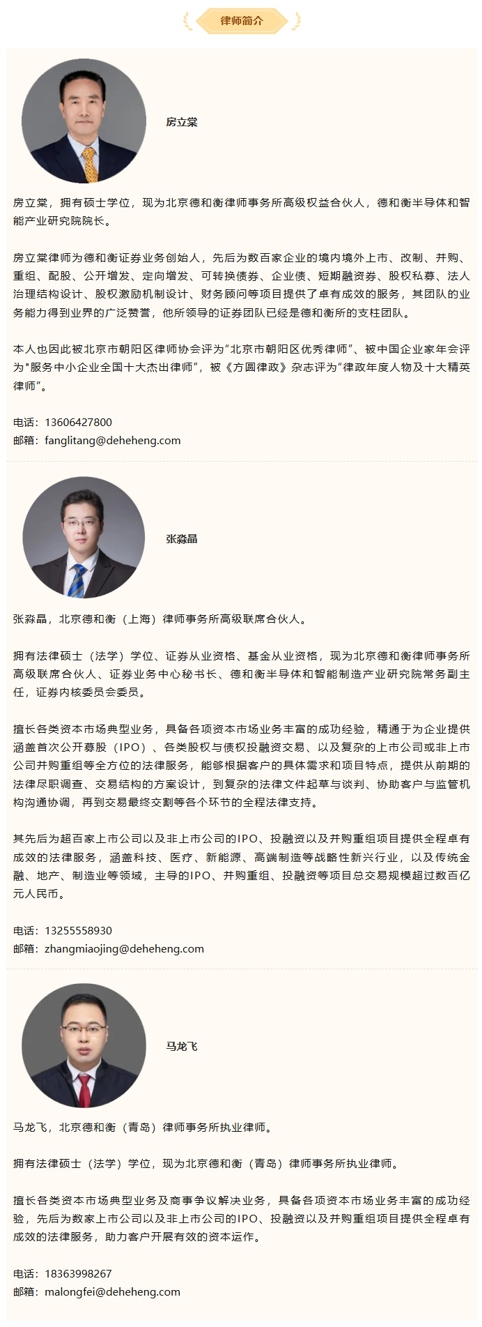 本项目由德和衡集成电路产业团队承办,团队成员包括高级权益合伙人房立棠、高级联席合伙人张淼晶与资深律师马龙飞。他们深入行业的理解、卓越的执行能力以及以客户为中心的服务理念,赢得了客户的高度认可和信任。