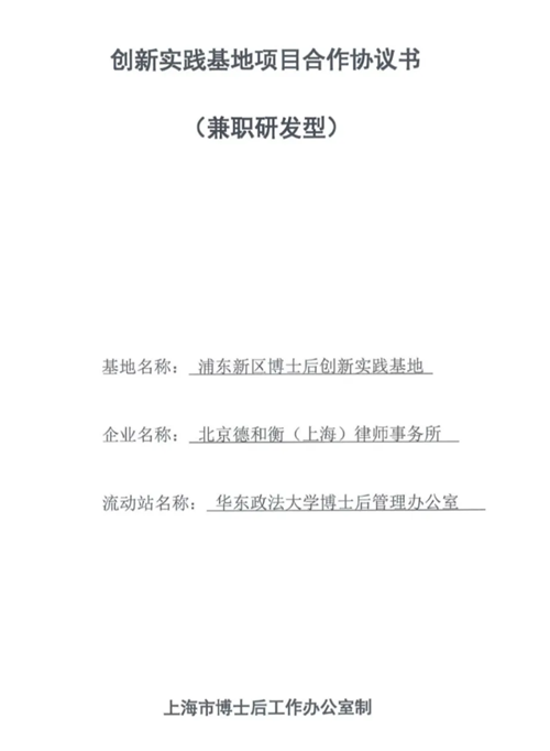 2025年10月15日,北京德和衡(上海)律师事务所在浦东新区博士后创新实践基地鉴证下,正式与华东政法大学博士后管理办公室签署《联合培养项目博士后研究人员合作协议书》。在接下来的两年内,德和衡(上海)将在上海市浦东新区司法局、上海市浦东新区人才服务中心的指导下,携手华东政法大学联合培养博士后法律研究人员共同推动法律实践与学术研究的深度融合。