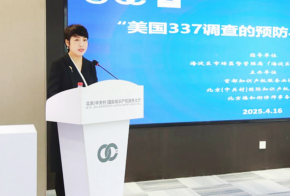 2025年4月16日,在北京市海淀区市场监督管理局(区知识产权局)的指导下,由北京德和衡律师事务所与首都知识产权服务业协会共同主办《美国337调查的预防与应对》专题研讨会,在北京(中关村)国际知识产权服务大厅国际报告厅成功举办。来自企业、律师事务所、知识产权代理机构的50余位代表参会,共同探讨美国337调查的风险防范和应对策略。会议由北京德和衡律师事务所知识产权部主任王文俊律师主持。