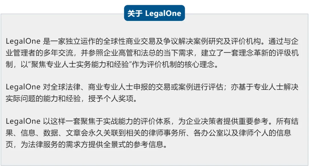 2024年10月4日,国际法律服务评级和研究公司LegalOne就北京德和衡律师事务所高级权益合伙人于皓宇律师主办的“商业秘密侵权案凸显刑事与民事诉讼之间的复杂相互作用”案例做出LegalOne Merits(Exemplary/典范)评级认可。