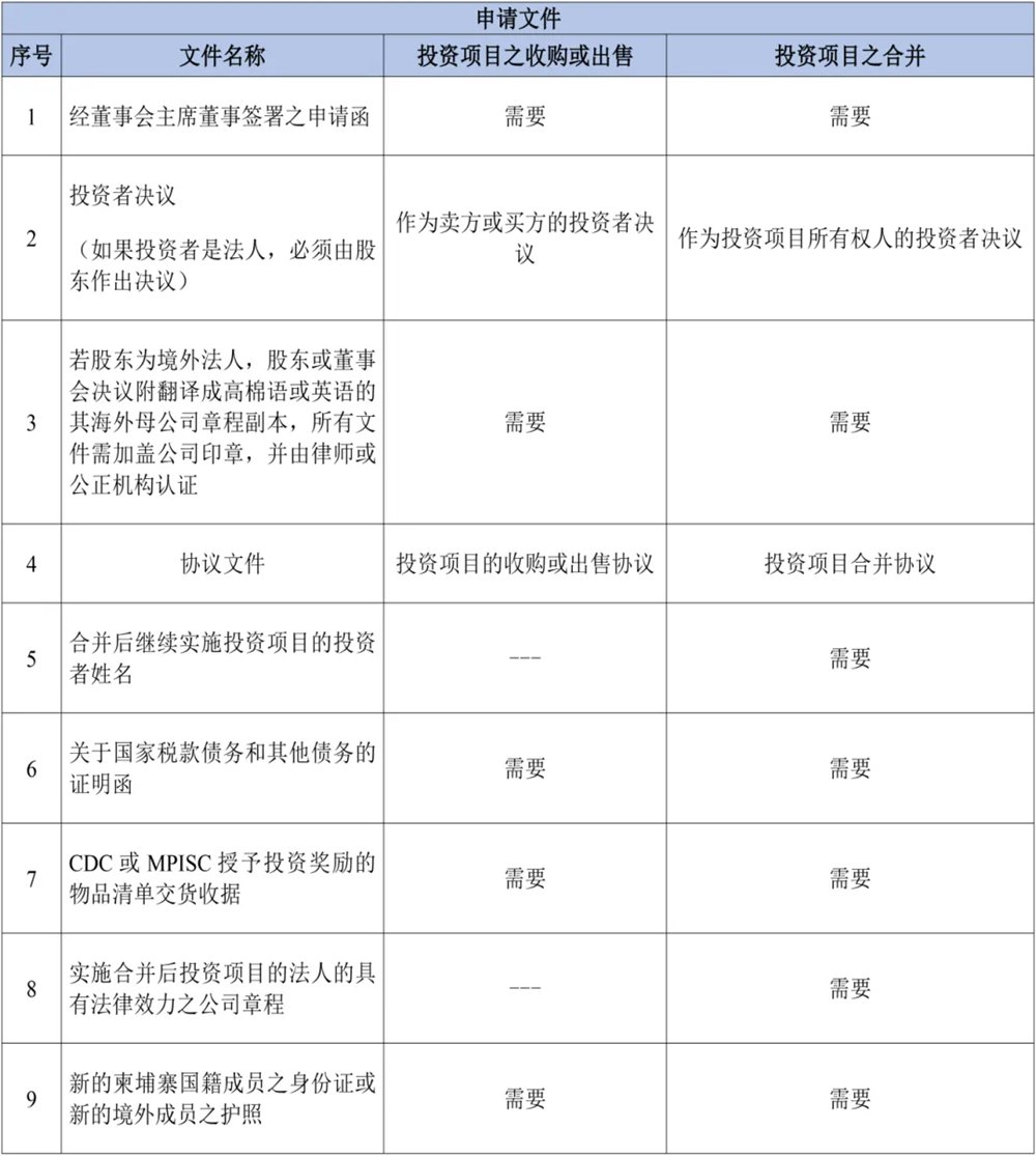 拟收购或出售投资项目的主体需要向CDC或MPISC提交书面的申请及其他必要的文件。经CDC或MPISC审核后并对实施投资项目的法人实体之新备忘录和公司章程进行正式批准和认证后,合格投资项目被视为完成收购、出售或合并,具体实施合格投资项目的投资人将获得收购、出售或合并后合格投资项目现有的权利和并继续履行现有的义务。根据情况不同,相关主体需准备的申请文件也有所不同,具体如下表所示: