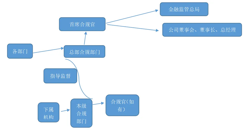 上述图中直线箭头表示汇报关系。通过上图可见,总公司合规部门与下属机构合规部门之间并不存在直接领导关系,只是指导与监督的关系;在首席合规官与合规官之间也并没有明确的汇报关系;首席合规官对于合规管理人员的选聘、业务指导、工作汇报、考核管理、合规官提名从监管角度也仅仅是鼓励统筹。但《合规办法》第十八条又规定,首席合规官应对本机构及其员工的合规管理负专门领导责任。