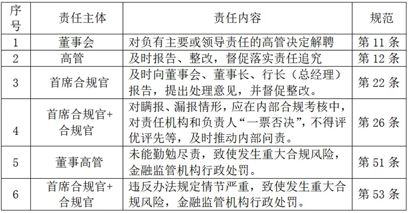 对于重大合规风险发生后的问责追究工作,《合规办法》仅规定了部分环节,见下表: