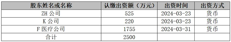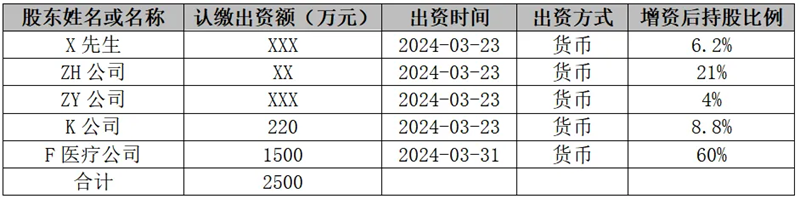 2024年3月,F公司召开了公司2024年第1次股东会。基于K公司与ZH公司于2023年10月签订的《一致行动人协议》,以实际到会股东3人(占股总额78%),最终100%总股数表决同意通过了原股东会决议:1.审议通过了公司2023年度经营情况以及2024年度财务预算;2.同意公司注册资本将由1000万元增至2500万元,F医疗公司作为新的股东并增资1500万。再以实际到会股东4人(占股总额92%),最终100%总股数表决同意通过了新股东会决议:1.同意由F医疗公司、ZH公司、ZY公司、X先生及K公司组成新的股东会,分别认缴出资1500万元人民币、XXX万元人民币、XX万元人民币、XX万元人民币以及220万元人民币;2.根据新《公司法》及公司经营实际的需要,就上述决议事宜修改了公司章程,将原公司章程约定的出资时间2050年12月31日进行调整,即ZH公司、ZY公司、X先生及K公司的出资时间调整至2024年3月23日,F医疗公司的出资时间调整至2024年3月31日。