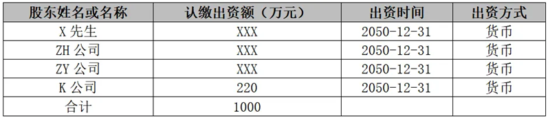 2023年9月,北京某科技有限公司(以下简称“K公司”)与投资标的F公司初步达成投资意向,拟以受让F公司股东部分股权方式成为F公司的战略投资股东。据此,F公司股东之一,北京某科技合伙企业(有限合伙)(以下简称“ZH公司”)与K公司签订《转让协议》,ZH公司同意将其当时认缴持有F公司的22%(注册资本折算价值220万元)股权转让给K公司。自双方签字(盖章)之日起,ZH公司对已转让的出资不再享有出资人的权利和承担出资人的义务,K公司以其受让的股份在企业内享有出资人的权利和承担出资人的义务。同日,F公司进行了股权变更登记,新增K公司为股东,持股22%。同日,F公司变更章程内容,约定含K公司在内的四位股东的出资时间为2050年12月31日(详见下表)。