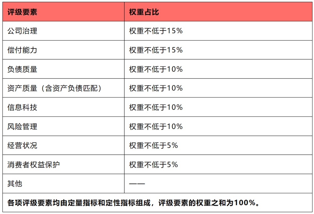 考虑到不同类型公司在经营管理和风险特征上存在不同,允许设置差异化的评级要素,具体如下:1.评级要素的调整—按照机构类型保险集团(控股)公司可适当调整负债质量、资产质量(含资产负债匹配)、消费者权益保护评级要素等级;再保险公司可不设置消费者权益保护评级要素。2.评级要素的调整—按业务和风险特征金融监管总局根据不同类型保险公司的业务和风险特征,可以设置差异化评级要素,权重不高于15%。