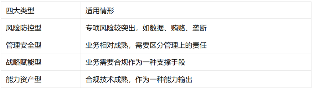 鉴于此,总结本人带领的龙龘合规团队多个项目经验和本人"法律+管理"原创方法,在原有合规管理价值探讨的基础上,我提出如下四种类型的合规管理,供各企业、各同行参考。