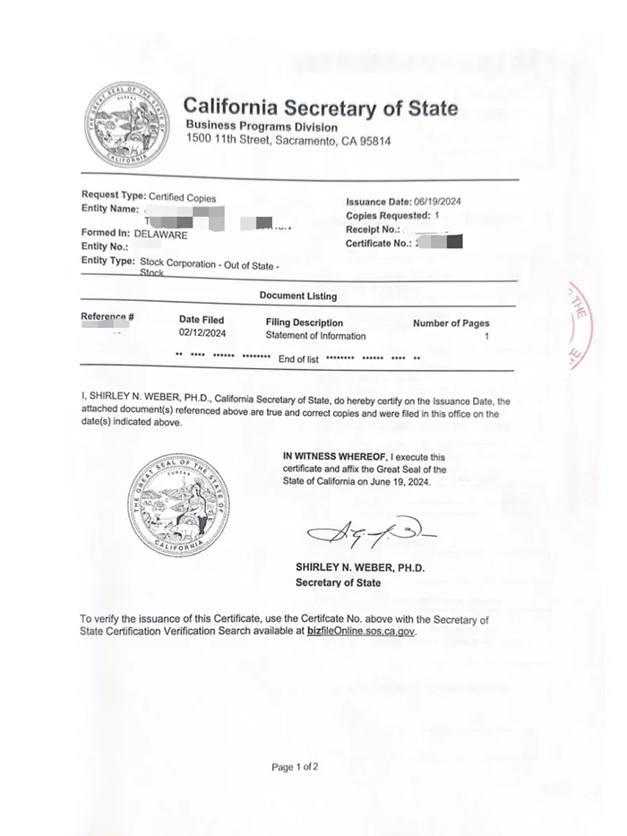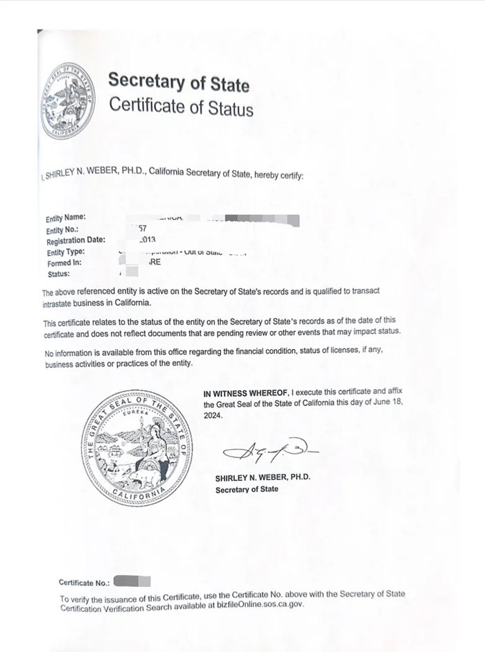 在主体资料公证方面,加州公司一般需要提供信息申报书(statement of information)、存续证明(Certificate of good standing)。