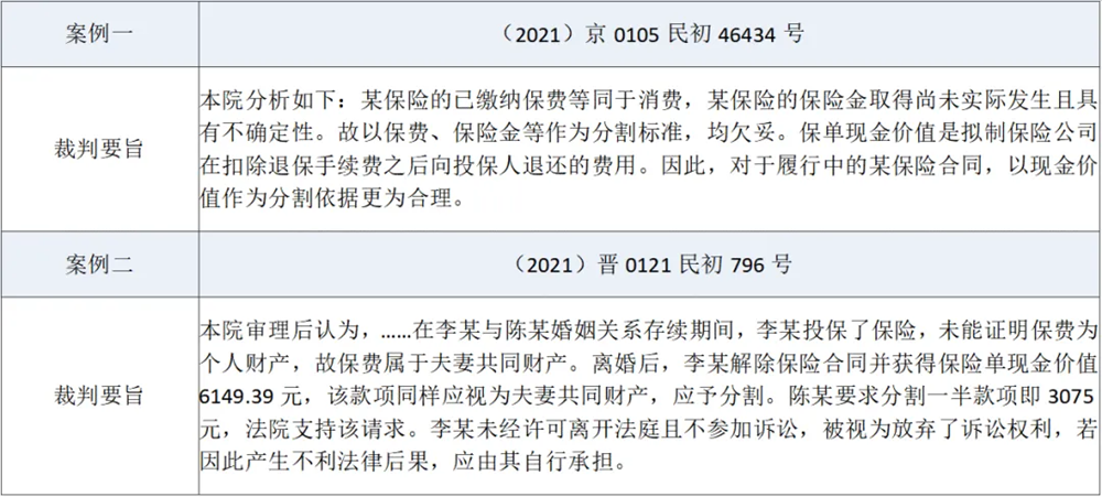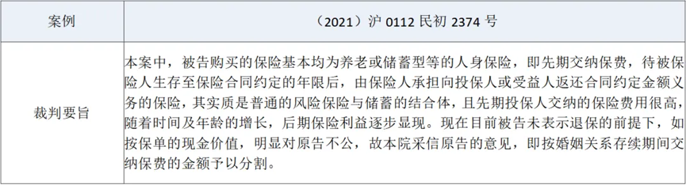 但也存在例外,例如一些保险的购买时间较短,且其实质为普通的风险保险与储蓄的结合体,此时保费大于保单的现金价值,仍对现金价值进行分割会造成资产损失,有失公平,因此直接对婚姻存续期间交纳的保费进行分割。