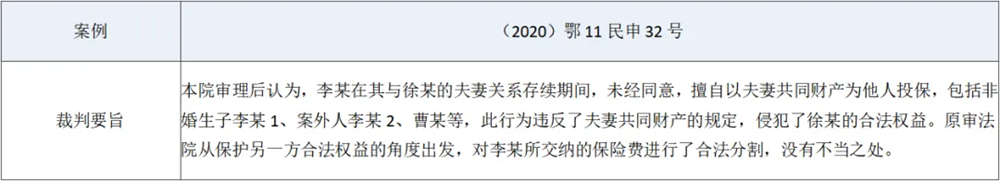 根据《民法典》第一千零六十三条规定:下列财产为夫妻一方的个人财产:(一)一方的婚前财产。依据该条款,可知夫妻一方能够证明其婚前以个人财产购买保险,则投保产生的保险利益不属于夫妻共同财产,在离婚时不予以分割。反之,夫妻共同财产购买的保险,购买保险的行为发生在婚姻存续期间,无论是保险的保单价值抑或保费,应作为夫妻共同财产进行分割。如夫妻一方在婚前购买保险,以个人财产交纳了部分保费,在婚后继续投保交纳保费,保费来源于夫妻共同财产,离婚时应对保险进行分割,其中分割规制为扣除婚前投保的金额现金价值后,分割剩余婚内投保金额现金价值。
