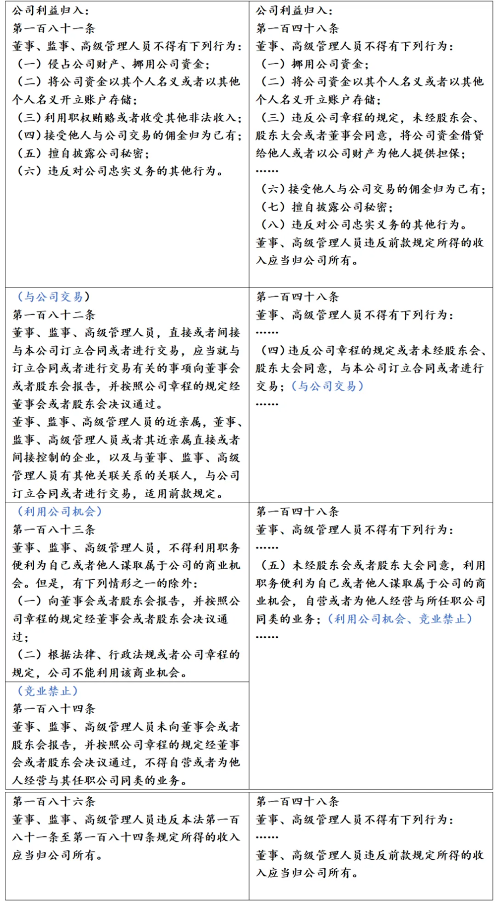 同样,新《公司法》也在原《公司法》的基础上对忠实义务进行了进一步的规定,新《公司法》第一百八十条第一款规定:“董事、监事、高级管理人员对公司负有忠实义务,应当采取措施避免自身利益与公司利益冲突,不得利用职权牟取不正当利益。”忠实义务核心是“不得利用职权谋取不正当利益”,董监高应尽量避免个人利益与公司利益发生冲突。原《公司法》第一百四十八条第一款规定了七项具体的违反忠实义务的行为,并辅以第八项的兜底条款,值得注意的是该项法律规定只适用于董事和高级管理人员,不包括监事。但是新《公司法》第一百八十一条到第一百八十五条的违反忠实义务的规定一体适用于董监高三个主体,新《公司法》关于董监高违反忠实义务行为的列举,承继于原《公司法》第一百四十八条第一款的规定,同时在此基础上,通过第一百八十二条到第一百八十五条的详细规定,完善了与公司交易、同业竞争、谋取公司商业机会等与公司存在潜在利益冲突行为的内容,使之更为科学。[4]尽管规制董监高个人利益与公司利益的冲突是忠实义务的核心内容,但是新《公司法》对于董监高与公司利益冲突的情形采取的并非绝对禁止的做法,而是在第一百八十二条到第一百八十五条中,采取“原则禁止,例外允许”的方式,对于与公司交易、同业竞争、谋取公司商业机会等董监高与公司可能存在潜在利益冲突的行为,如果向董事会或者股东会报告,并按照公司章程经董事会或者股东会决议批准,则可以不被禁止。