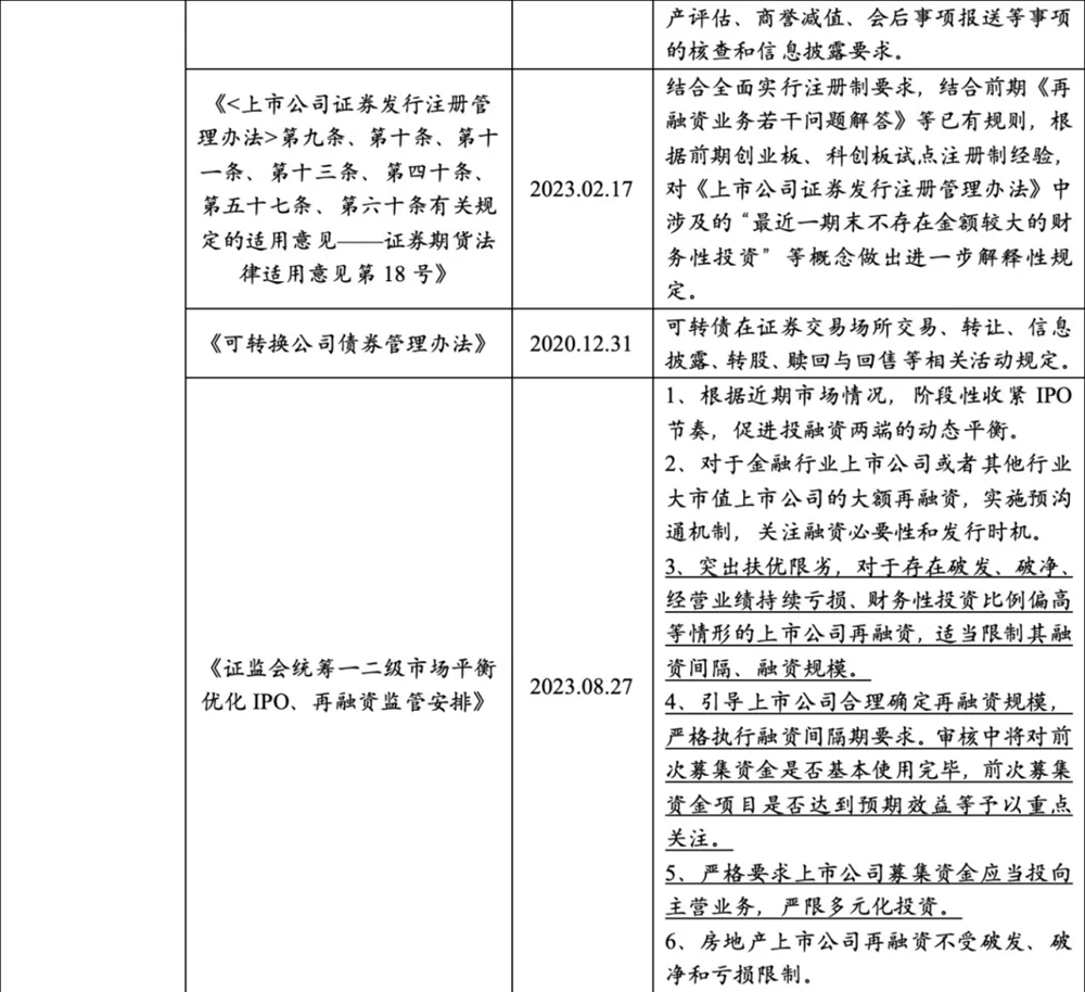2023年8月27日,中国证监会发布《证监会统筹一二级市场平衡优化IPO、再融资监管安排》(以下简称优化再融资监管安排),明确了当时再融资监管的总体要求。2023年11月08日,上海、深圳证券交易所有关负责人分别就优化再融资监管安排相关情况答记者问,强调优化再融资监管安排是在现有做法基础上,基于当前市场状况,对上市公司再融资节奏、融资规模等作出更加从严和从紧的安排,重点突出扶优限劣,引导资源向优质上市公司集聚,更好地统筹一二级市场平衡,维护资本市场良好的融资秩序。