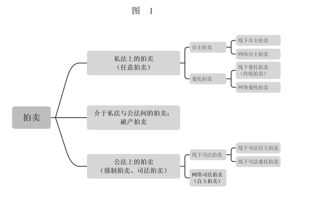 拍卖是竞买人(其中以最高应价购得拍卖财产的竞买人为买受人,下同)通过一定规则竞争决定价格以达成交易的过程。根据拍卖权源的不同,可以分为私法上的拍卖(任意拍卖)、公法上的拍卖(强制拍卖或称司法拍卖)以及介于私法与公法之间的破产拍卖;根据是否借用网络这一技术手段,可以分为线下拍卖和网络拍卖;根据是否委托专业拍卖机构,可以分为自主拍卖和委托拍卖。如此,便形成了整个“拍卖”的概念体系(见图1)。网络司法拍卖作为一种公法上的拍卖、线上拍卖、自主拍卖,与其他拍卖概念相区别。