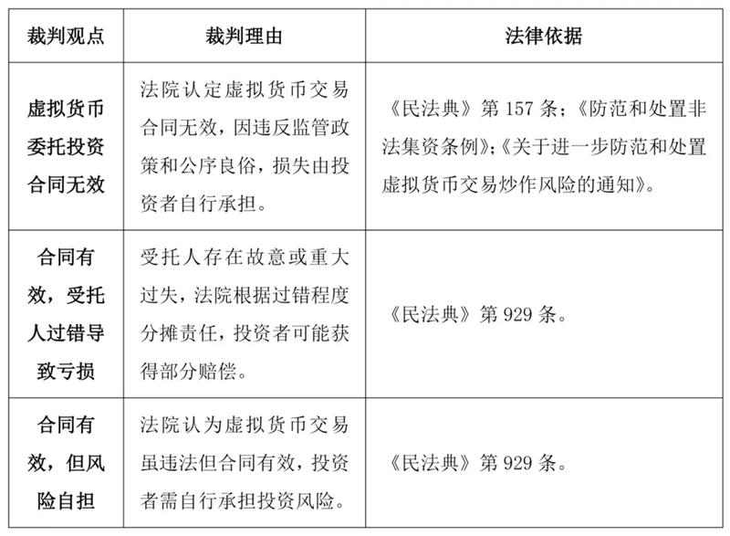 具体而言,裁判观点可以分为三类。第一类是合同无效,后果自担。在(2021)浙1003民初2034号、(2022)陕04民终1225号案件中,法院经审理认为,本案案涉标的物本身不具有合法性,故双方关于该交易物的委托托管行为亦不受法律保护,《数字货币量化委托协议书》属于无效合同。案涉投资款被告张某应当予以返还。因黄某明知委托投资虚拟货币违反国家规定,具有过错,不支持利息赔偿的主张。