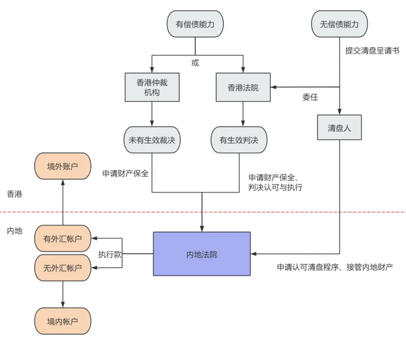 根据《关于内地与香港特别行政区法院相互认可和协助破产程序的会谈纪要》以及《最高人民法院关于开展认可和协助香港特别行政区破产程序试点工作的意见》,内地法院可通过互惠原则认可香港破产程序,香港清盘人向内地在港上市企业主要财产所在地的内地中级人民法院申请,经法院认可香港清盘程序为主要破产程序、清盘人有权在内地行使其职权,则清盘人可接管、处理该企业在内地的财产,并代表该企业在内地法院参与诉讼、仲裁以实现债权追索。