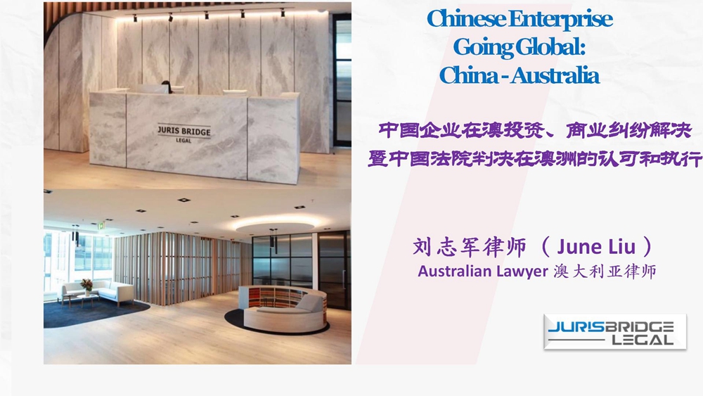 澳大利亚Jurisbridge Legal律所合伙人刘志军通过线上方式,分享了澳大利亚外商投资及商业纠纷的司法实践,以及对中国判决书的承认与执行。刘志军律师表示,澳大利亚作为世界最发达经济体之一,加之相对稳定的政治环境、健全的法律体系与规范的金融市场,已成为全球投资者青睐的目的地之一,中国企业在澳大利亚投资时,应充分了解当地法律环境,加强风险防控意识,通过寻求专业法律支持,维护企业合法权益。