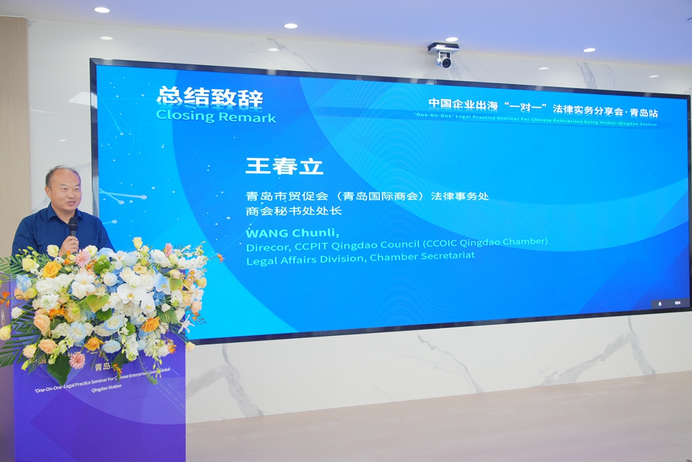 最后,青岛市贸促会(青岛国际商会)法律事务处、商会秘书处处长王春立总结致辞。王春立处长首先对本次活动的成功举办表示热烈的祝贺,并对与会嘉宾的精彩演讲和分享表示感谢。他表示当前国际形势复杂多变,企业面临的涉外法律风险和挑战日益增多,青岛市贸促会(青岛国际商会)将继续发挥桥梁纽带作用,通过举办专业、高效的讲座培训活动,拓宽会员企业在跨境投资、贸易及法律风险防范等方面的视野,提升国际竞争力。