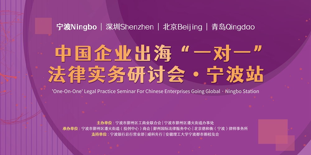 本次研讨会由宁波市鄞州区工商业联合会、宁波市鄞州区潘火街道办事处主办,由宁波市鄞州区潘火街道(投创中心)商会、鄞州国际法律服务中心、北京德和衡(宁波)律师事务所承办,并得到了宁波银行总行营业部、威科先行、安徽理工大学宁波都市圈校友会的大力支持。本次研讨会从出海/准入政策、海外运营合规、外汇税务制度、争议解决司法路径等多个领域,结合实务经验,为中国企业出海投资布局建言献策。