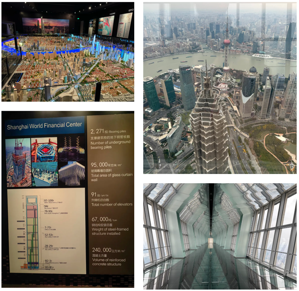 大家一起乘坐直达94层电梯参观了位于94层、97层和100层的空中观光层。在位于100层透明玻璃层,大家俯瞰陆家嘴高楼林立,饱览浦江两岸美景。该三层作为空中舞台目前不再开放个人观光,而主要用于企业的新品发布、峰会论坛、文艺展览、时尚走秀、晚宴酒会等商业活动。
