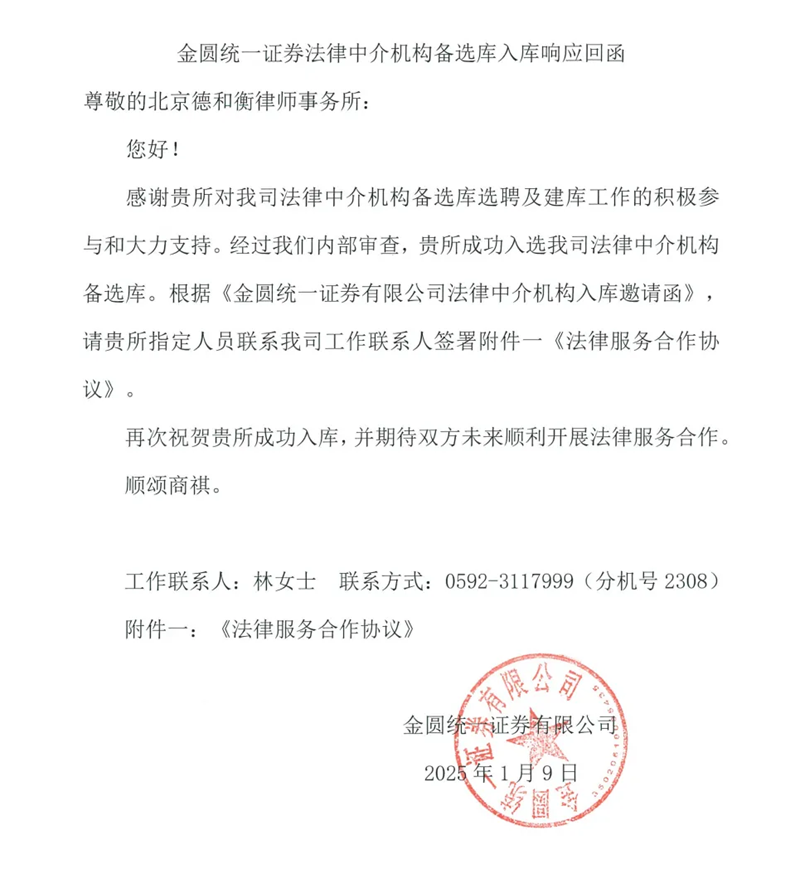 金圆统一证券有限公司作为国内重要的证券公司之一,在证券专项服务领域具有广泛的影响力和卓越的声誉。此次中标,不仅是对德和衡专业能力的高度认可,更是对其过往在证券公司专项法律服务领域所取得成绩的肯定。德和衡将秉持“专业、专心、专才、专注”的服务理念,以专业化的团队为依托,以先进的管理经验为保障,为金圆统一证券有限公司提供专业、优质、高效的法律服务。
