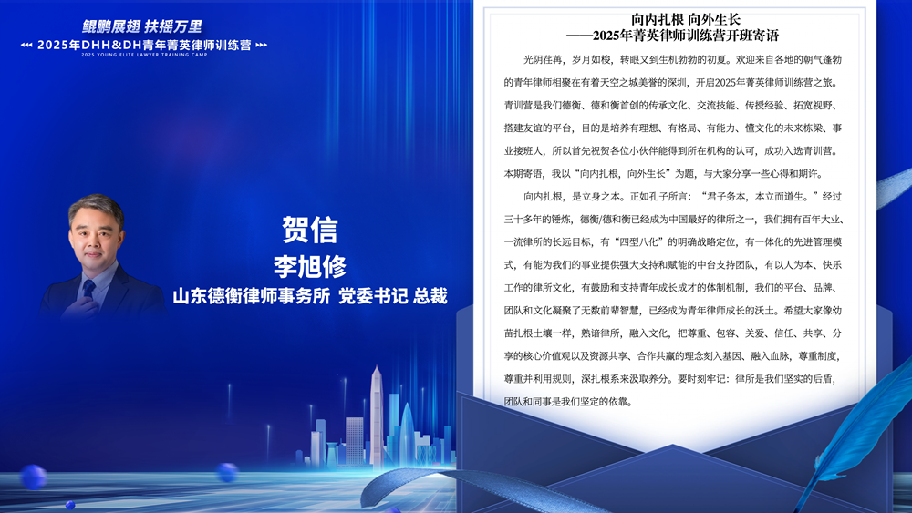 合伙人会议主席胡明、山东德衡律师事务所总裁李旭修、北京德和衡律师事务所总裁刘克江为本次青训营致以贺信。