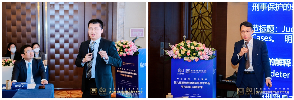 德和衡高级权益合伙人、德和衡研究院绿色低碳分院院长王海军律师,德和衡(福州)律师所首席联席合伙人陈锴律师,德和衡高级权益合伙人陆阳律师,德和衡(长沙)律师所首席联席合伙人段启俊律师,德和衡权益合伙人秦辉律师、张磊律师依次登台,分别以《欧盟碳边界调解机制的影响和中国因应——以涉外法治建设为视角》《执行程序中推行带押过户的可行性研究》《新<公司法>下债权人主张股东出资加速到期研究》《转交贿赂过程中截留财物行为的定性研究》《全面注册制下从证券业务属性谈欺诈发行证券的罚与罪》和《“结构化发行”能否阻断债券虚假陈述纠纷案件中的交易因果关系》为题,从法律的各个方面分享了自己在律师实务工作过程中对理论问题的学术研究与思考成果。